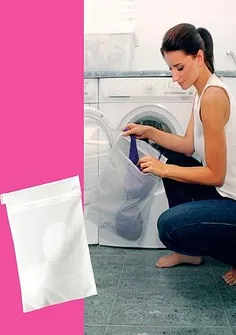 Мешок для стирки белья в машинеМешок для стирки женского кружевного белья в стиральной машине. Удобный вместительный большой мешочек белого цвета с застежкой на молнию защищает кружевное и тонкое белье во время стирки в стиральн...